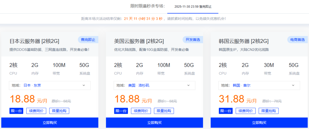 | 韩国 | 2G | 2核 | 50G | 30M | 31.88元/月 | 链接 |