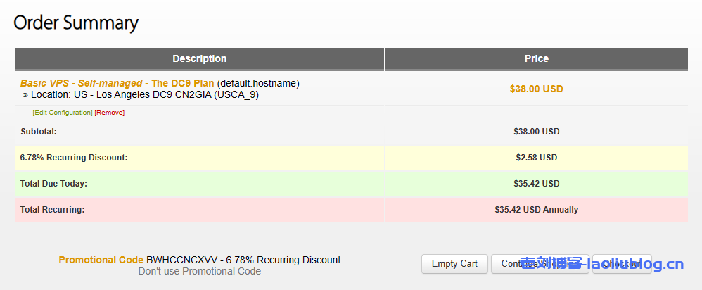 搬瓦工推出洛杉矶DC9 CN2GIA机型年付38美元方案-Basic VPS – Self-managed – The DC9 Plan,使用优惠码后价格实付35.42美元,1.5Gbps大带宽750GB月流量,有需要的快去看看吧~