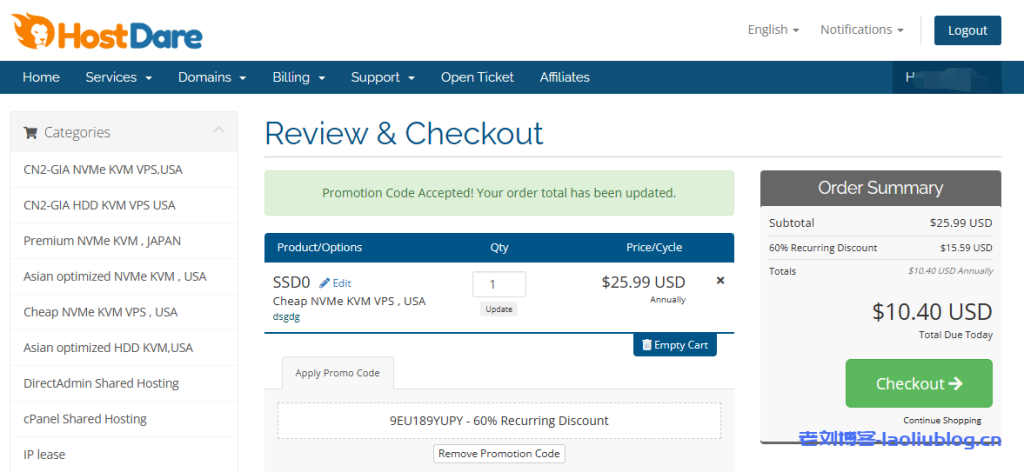 HostDare商家正在给旗下美国洛杉矶VPS,套餐名Cheap NVMe KVM VPS USA搞4折促销活动,适用于半年、每年、每两年和每三年付费周期,价格最低折后$10.4/年,配置1核/768M内存/10G NVMe/500g流量。机器开设在洛杉矶quadranet机房,商家支持PayPal、支付宝等付款。