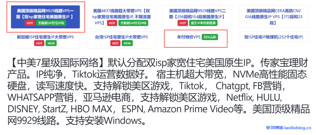 lisahost丽萨主机美国顶级精品网9929线路VPS,默认分配双isp家宽住宅美国原生IP,IP纯净,Tiktok运营数据好。 宿主机超大带宽,NVMe高性能固态硬盘,读写速度快。支持解锁美区游戏、Tiktok、Chatgpt、FB营销、WHATSAPP营销、亚马逊电商、Netflix、HULU、DISNEY、StartZ、HBO MAX、ESPN、Amazon Prime Video,支持安装Windows,KVM虚拟化,1个IPv4,最后一款是年付特价套餐: