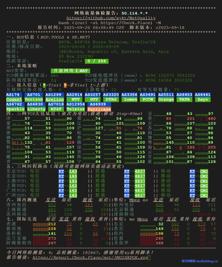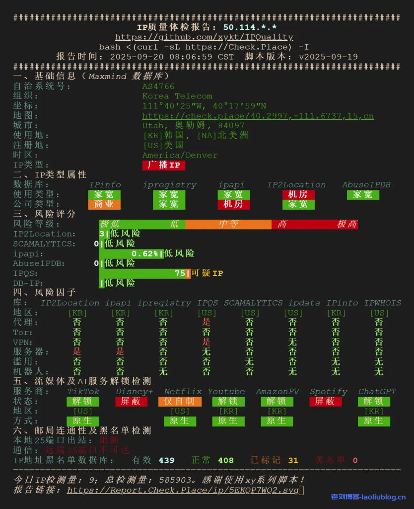 - 归属地:Korea Telecom (AS4766),但实际落地 Utah(美国犹他州),有一定 IP漂移现象